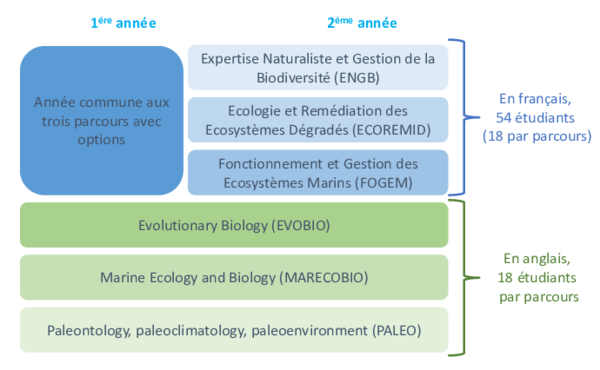 Les parcours EVOBIO, MARECOBIO et PALEO sont enseignés en anglais avec de nombreuses unités d'enseignement communes. La deuxième année du parcours MARECOBIO est délocalisée au département Station Marine de Wimereux.